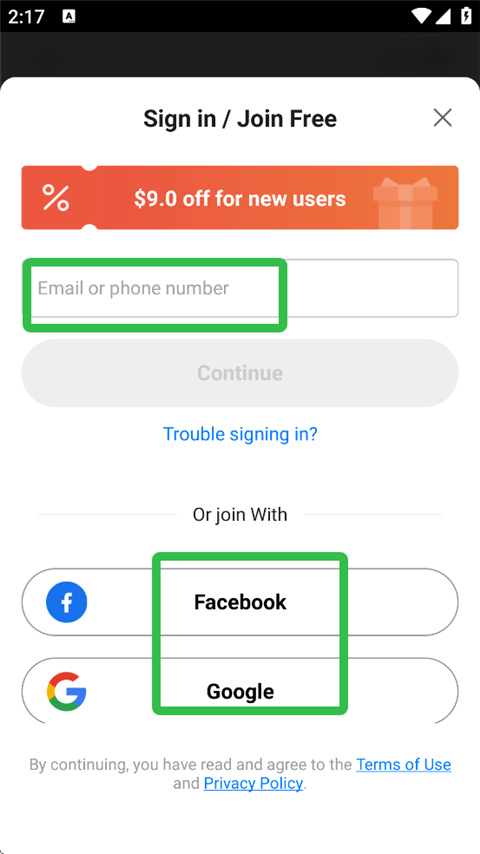 4、用户可使用电子邮箱或者电话号码进行注册登录,也可以选择facebook或者谷歌账号登录。