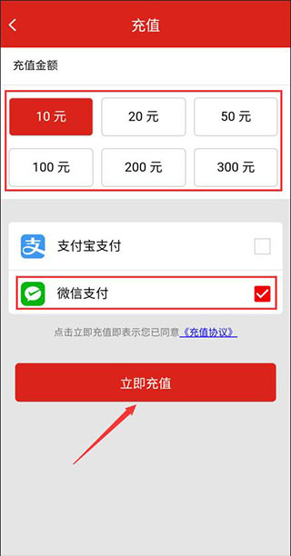 2、然后我们选择充值金额,再勾选微信支付,最后点击下方的【立即充值】按钮即可。