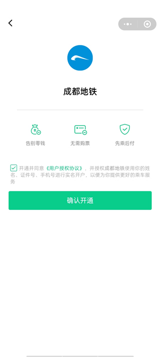 支持手机号、支付宝、微信登陆;扫码进站,支付方式可选支付宝(蚂蚁森林52g能量)和微信签约代扣。只支持成都地铁乘车,有轨电车蓉一蓉二没试过。