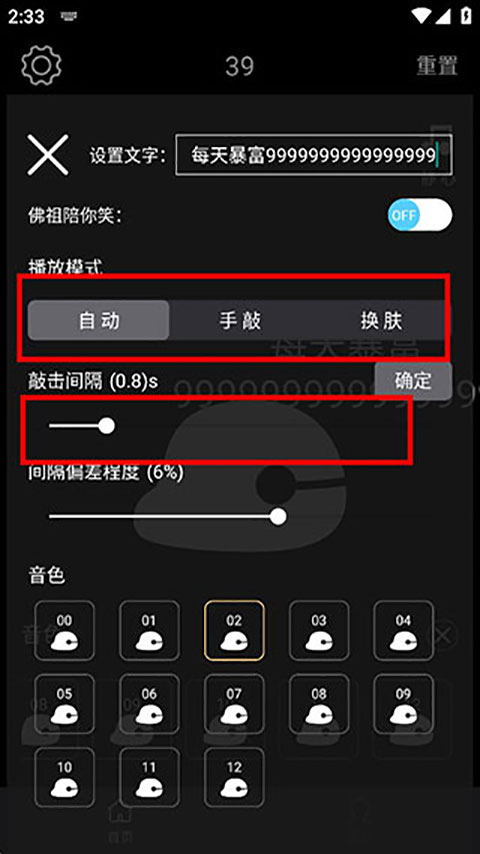 3、软件拥有自动和手敲2种敲击方式,大家可以根据的习惯进行选择,还可以调节敲击间隔以及木鱼音色。