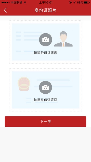 5、点击“下一步”按钮进入身份证拍摄页面,拍摄客户本人身份证正面和背面图像;