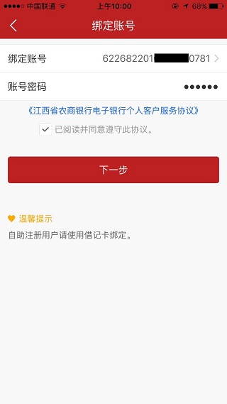 4、人脸验证通过后进入绑定账号页面,选择绑定账号并输入账号密码,勾选已阅读并同意遵守协议;