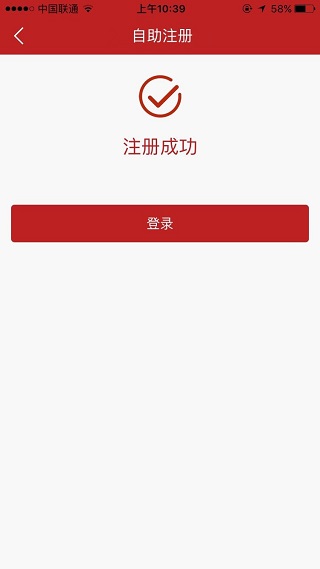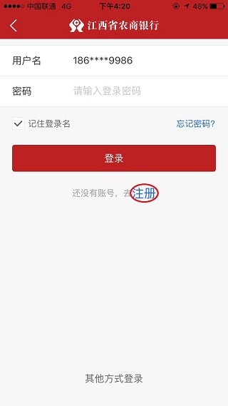 1、 自助注册,打开手机银行进入登录页面,点击“注册”按钮进入自助注册页面;