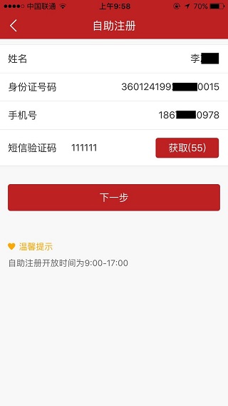 2、在自助注册页面中输入客户姓名、身份证号码、银行预留手机号、短信验证码,点击下一步进入身份核查页面;