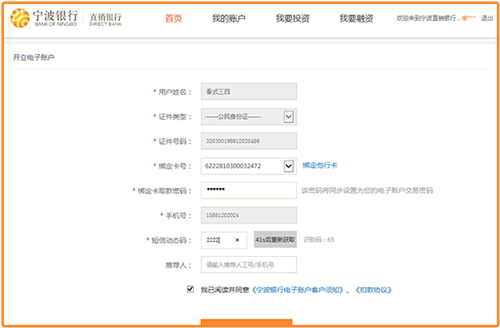 用户注册直销银行登录后输入本人姓名、身份证号并绑定用户的同名借记卡,经宁波银行核查验证通过后设置电子账户交易密码,即可开通宁波银行电子账户。