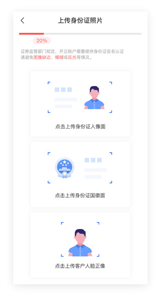 步骤2:上传身份证正反面和用户人脸正像(用户此处上传的正面照片系统会自动暂存并在视频见证环节展示,如符合要求,视频见证环节不再进行照片拍摄)