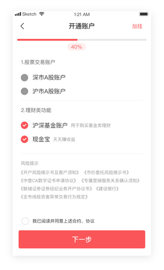 步骤5:账户选择。股票类、理财类账户都是默认勾选,可自行取消勾选。温馨提示:用户如果开通股东账户满三户以后,需选择右上角的加挂操作。中登时间(9:00-16:00)可以查询已有账户。