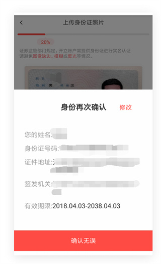 温馨提示:上传身份证后系统会自动识别证件上的身份信息,在提交时提醒客户核对自身信息是否有误。如有误请点击修改,确认无误后再进行提交。