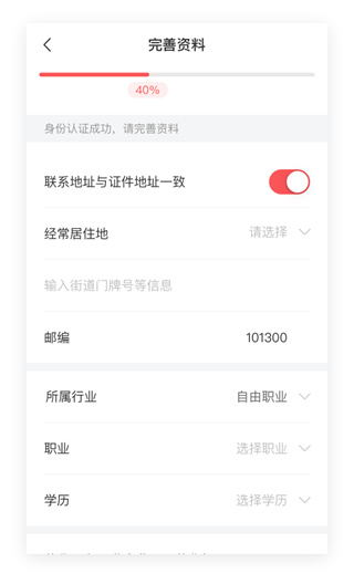 步骤3:完善资料。系统会自动默认联系地址与证件地址一致,用户如需变更,只需取消勾选,在下方的联系地址输入框中自行修改。(特别提醒:如果用户选择职业为证券从业人员,后续将无法开通股东账户)