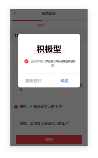 用户完成风险测评问卷后,系统打分生成相应的风险承受能力类型。类型分为:保守型,谨慎型,稳健型,积极型,激进型。