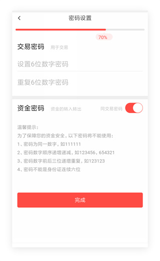步骤7:密码设置。系统会默认勾选资金密码与交易密码设置为一致,您可自行取消,另行设置资金密码。