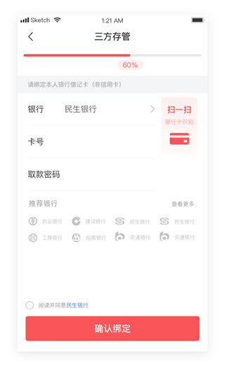 步骤6:银行三方绑定。支持扫描识别银行卡自动填充,也可以自行输入银行卡号。点击【查看更多】可以查看所有支持的银行。