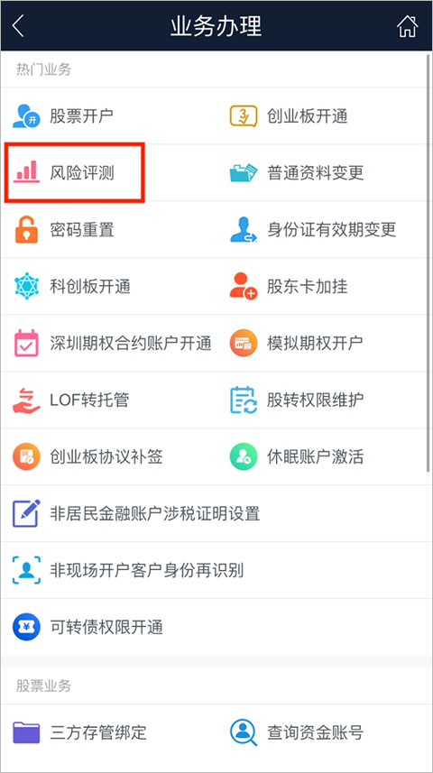 进入长城易软件,首页点击“业务办理”-“风险评测”,按照提示操作即可。