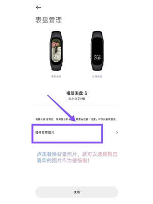 3、选择表盘之后进入界面,点击替换背景图片,选择使用。