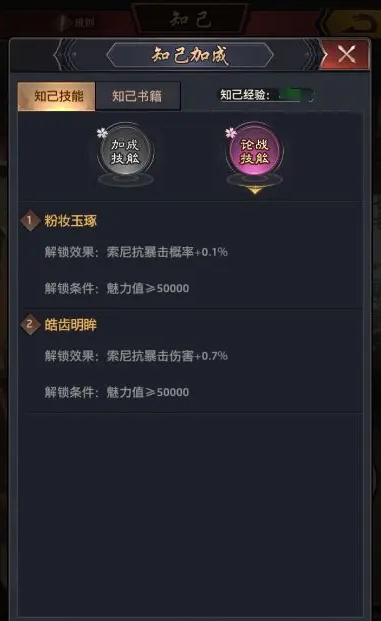 另一类是知己加成,这类加成只有拥有知己加成的门客可以获得,该技能可以提高门客在衙门中的抗暴击几率和抗暴击伤害,减少衙门战斗中对方的暴击几率和暴击伤害,可以在知己界面的知己加成中学习论战技能。