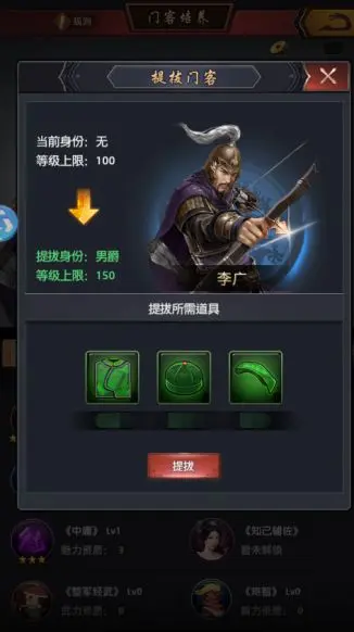 门客达到一定等级后会无法提升,这时可以使用升爵道具提升门客的身份爵位,提升后可以提高门客的等级上限和书籍的等级上限;