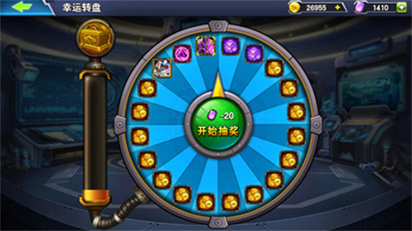 消耗1个轮盘代币(或20宝石)就可以转动一次轮盘,每次转盘都会有奖励,不会为空。转盘每转动一次,额外获得1点幸运指数,当幸运指数达到400点,转盘所有奖励内容变成UR宝箱。