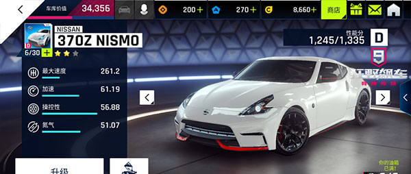 370Z NISMO在第一章的生涯模式和限时赛事中作用也非常大,并且性能分和操控性也较高,前期也可以重点升级,用于跑限时赛事赚取资源。
