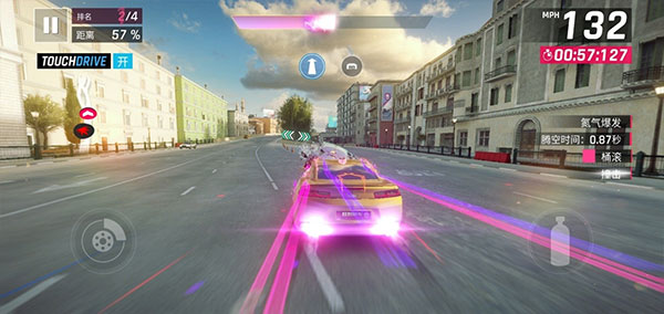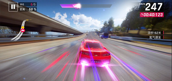 如果想要体验更真实的漂移和转向效果,当然不能错过重力感应模式。重力感应模式操作与智能驾驶一样,触摸左边屏幕漂移,触摸右边激活氮气,不过转向就变成了倾斜屏幕来控制。