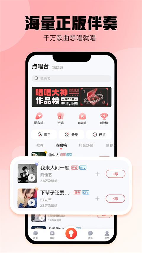 酷狗唱唱K歌App是专门为喜欢唱歌、听歌的用户打造的一款全民在线K歌应用平台,该软件具有海量高品质伴奏,多种顶级音效,让你开嗓即成天籁。除此之外,软件依托酷狗正版曲库,能为用户提供了非常丰富的歌曲,让你在手机上也能享受到和KTV一样的K歌乐趣。并且具有专业音效、智能打分、高品质伴奏、K歌直播、打擂评委和K歌社交互动等功能玩法,让你随心所欲畅享k歌乐趣。同时,酷狗唱唱界面清爽,没有任何广告,操作简单,点击即可听歌,并且支持用户进行点赞、评论、分享、收藏,当然你也可以加入合唱一起歌唱,另外软件还有好友互动功能,用户快速找到附近兴趣相投的好友,聆听作品。