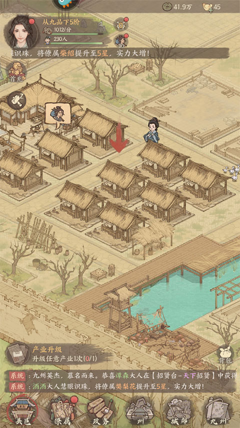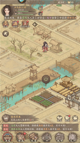 1、游戏画风有些泛黄古朴,有历史古风村落小镇的感觉,玩法就是要重振这个小县城,玩法也挺多的,抽卡、地皮任务和产出、政务、城郊巡逻、县令志都可以。