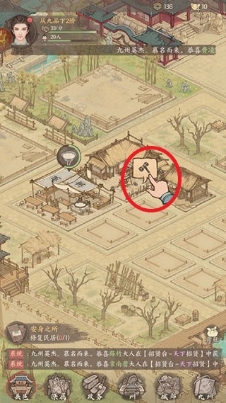 玩家点击空地上的锤子图标,即可使用金币建造民居,建造完民居可以将施完粥的流民引入,增加城市人口,提升自己的等级。