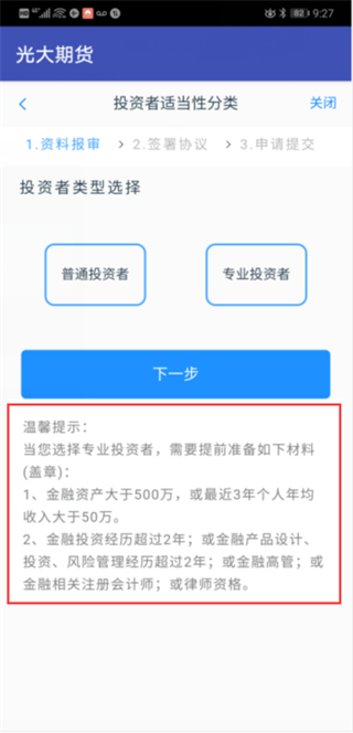 11、投资者类型选择:建议您选择“普通投资者”; 若选择专业投资者,则需要上传红框里的资料;