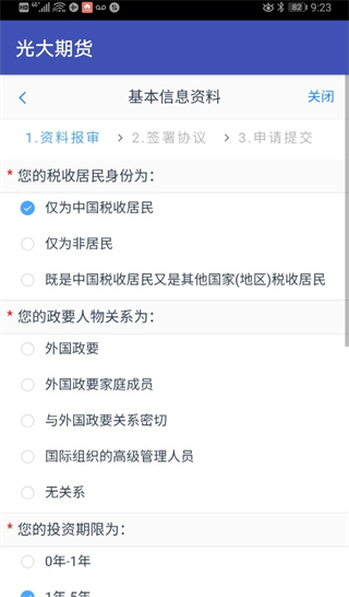 8、根据实际情况填写税收居民身份、政要关系等基本资料,点击“下一步”;