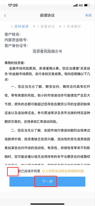 15、客户需要下拉并完整阅读所有协议,当下拉至协议最底部时,勾选“我已阅读并同意以上所有协议和业务规则内容”,并点击“下一步”;