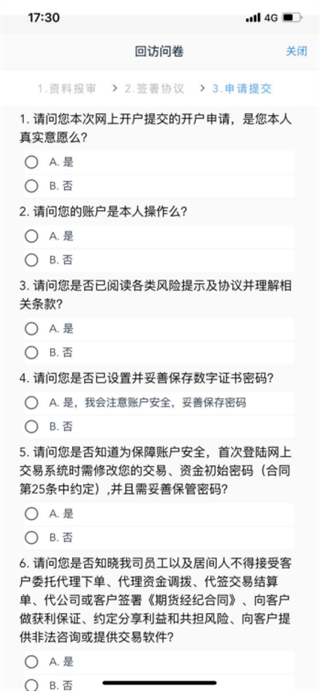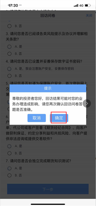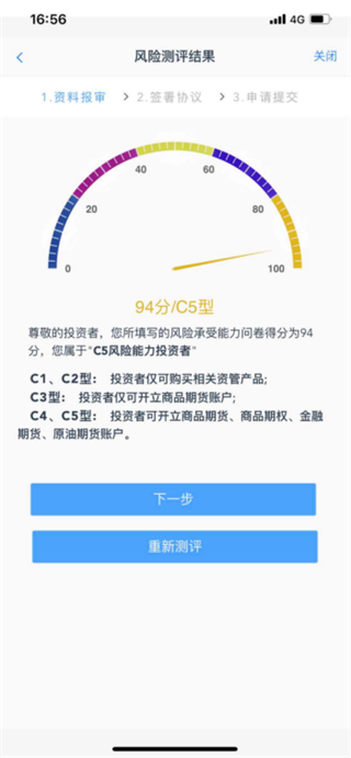 注意:若客户销户后再次提交开户申请,风险测评问卷会保留上次填写的结果,本次开户需重新填写,不能直接选择下一步,否则将会被退回。