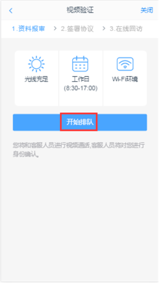 16、准备好身份证原件,点击“开始排队”,进入视频见证环节;