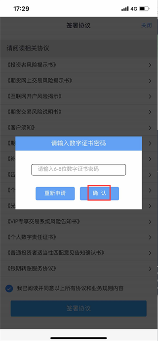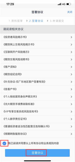 20、此处协议内容已在步骤7中阅读完成,因此此处无需再点开协议,直接勾选下方“我已阅读并同意以上所有协议和业务规则内容”,并点击“签署协议”即可;